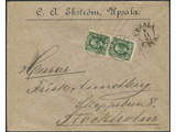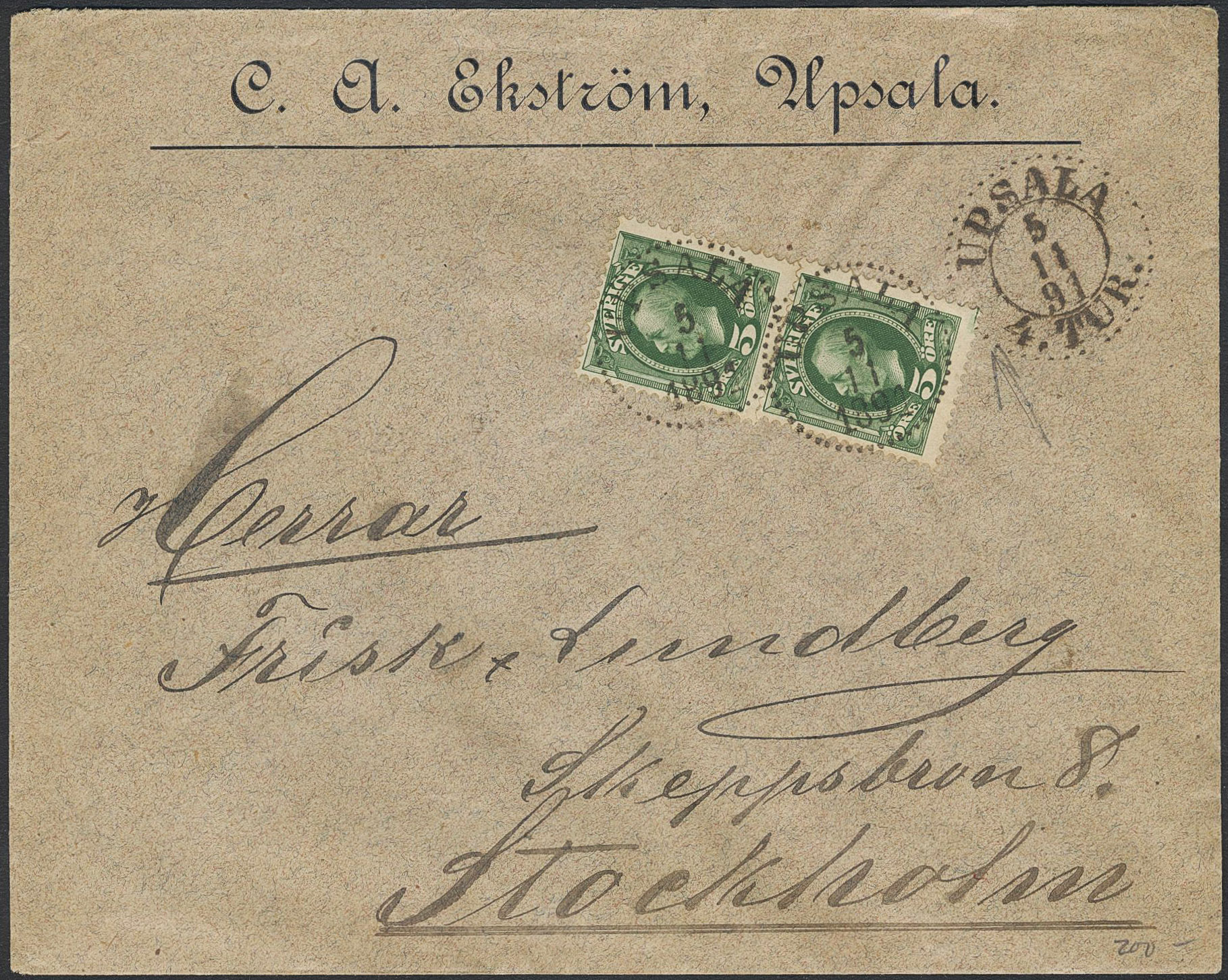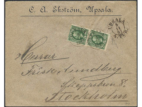 Sweden. Facit 52a1 on cover, Oscar II 5 öre weakly yellowish deep green in two copies on inland cover of lowest rate cancelled UPSALA 5.11.1891. One stamp showing a plate-joining line ('lödskarvlinje') in lower margin.