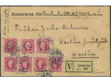 Sweden. Facit 54g (x7) on cover, 1909 Oscar II 10 öre carmine, strongly toned paper in seven copies on inland cover insured for 582 kr 50 öre, cancelled LJUNGBYHED 25.2.1911 with label. Note 'frim af afs' (stamped by sender).
