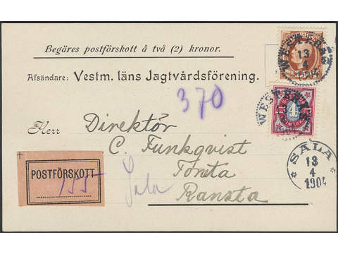 Sweden. Facit 55c, 64d on cover, Oscar II 15 öre dull reddish brown and 4 öre bicoloured numeral type on inland printed matter with C.O.D. of 2 kr cancelled WESTERÅS 13.4.1904. Superb item!
