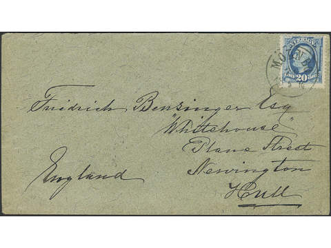Sweden. Facit 56c on cover, Oscar II 20 öre slate blue as single franking on cover of lowest rate to Hull, United Kingdom, cancelled MÖLNBO 24.5.1894. Beautiful cover of exhibition quality.