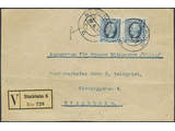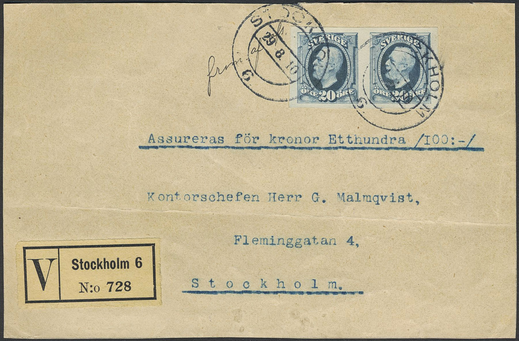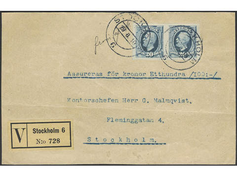 Sweden. Facit 56v1d on cover, 1896 Oscar II 20 öre blue, also on toned paper, imperf variety in pair on insured cover front sent locally in Stockholm cancelled STOCKHOLM 6 29.8.10. Note 'frim af afs' (stamped by sender). Rare item!