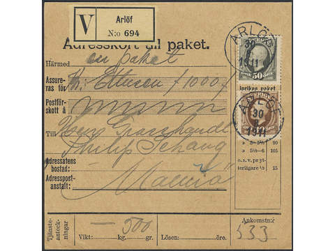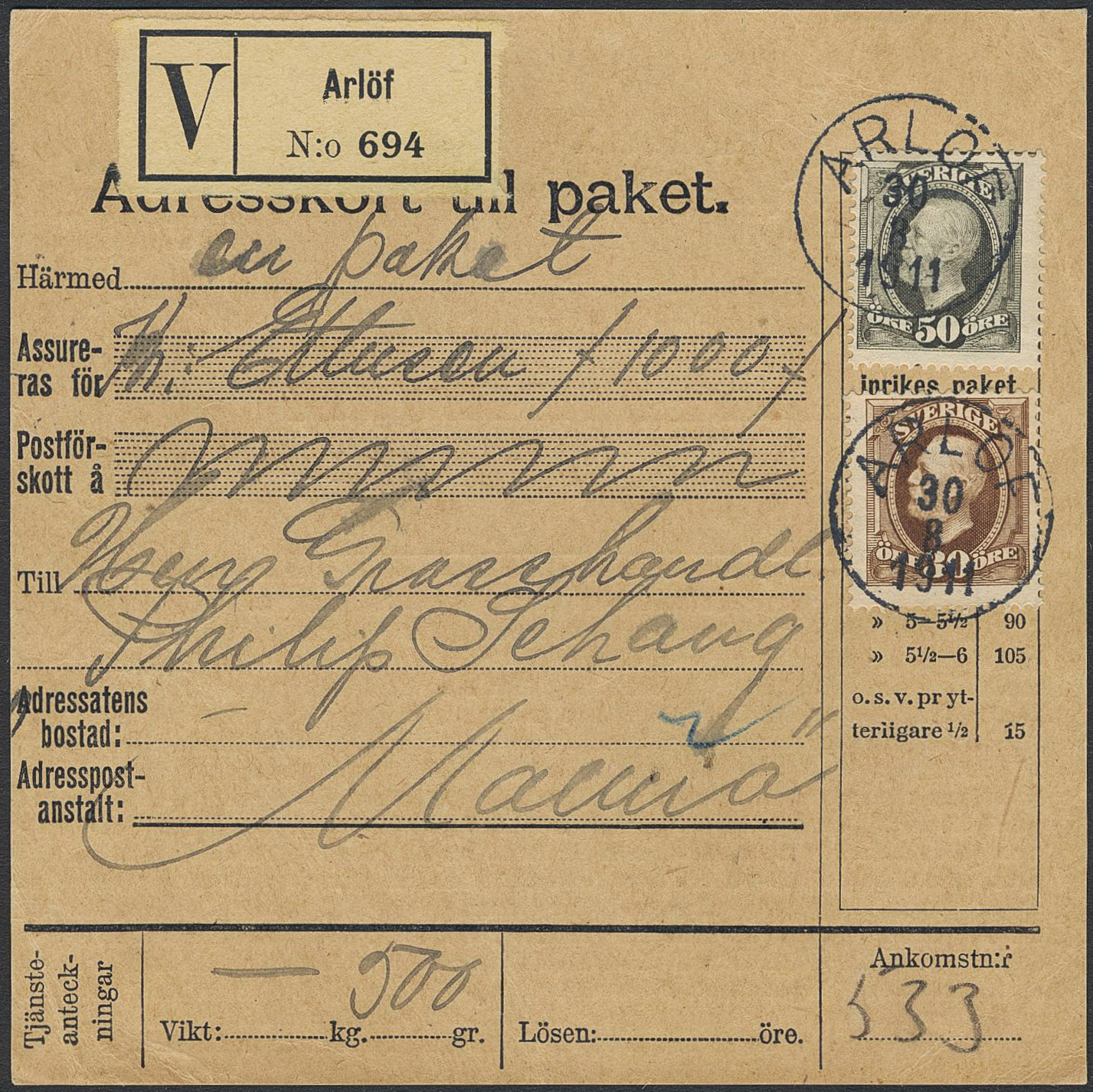 Sweden. Facit 59d, 58d on cover, Oscar II 50 öre olive-grey and 30 öre dark brown on inland parcel card insured for 1000 kr with beautiful cancellations ARLÖF 30.8.1911.