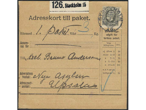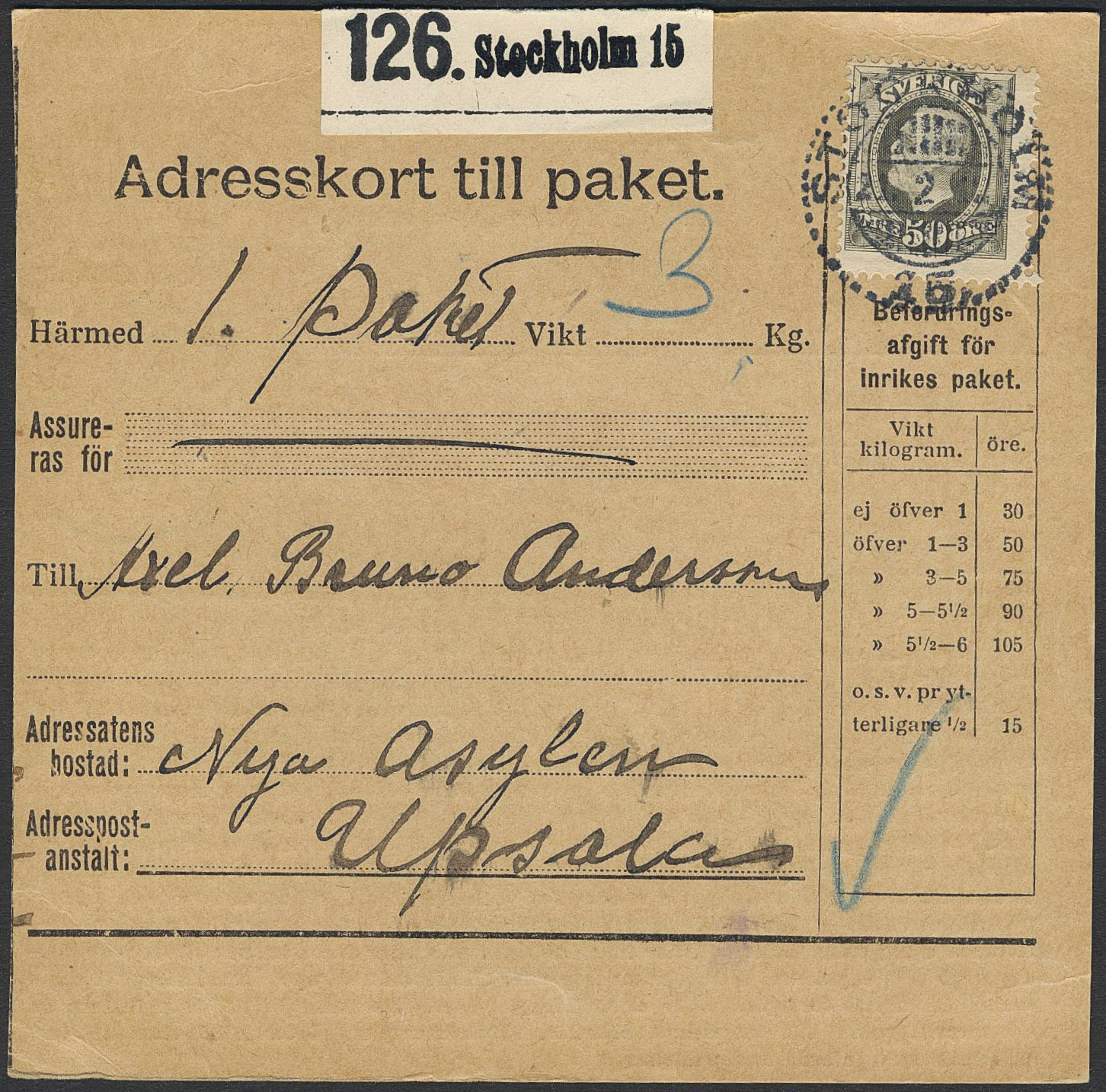 Sweden. Facit 59d on cover, Oscar II 50 öre olive-grey as single franking on domestic parcel card with beautiful cancellation STOCKHOLM 15 21.2.12.