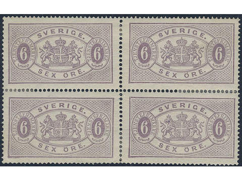 Sweden. Official Facit Tj4f ★, 6 öre lilac, perf 14, yellowish paper. Block of four. Very fine–superb. Opinion (shade) by O.P. SEK 11000+