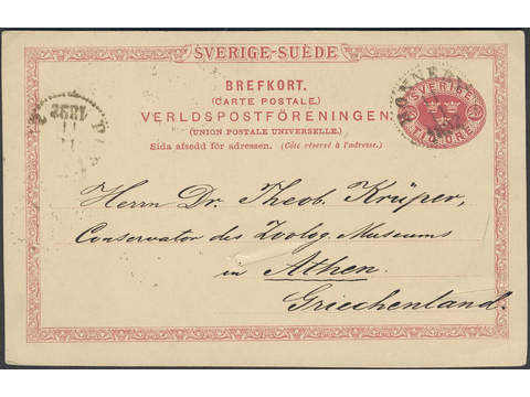 Sweden. Postal stationery, Single postcard, Facit bKe13, Postcard 10 öre sent from RONNEBY 11.11.1892 to Greece. Two small cuts in the card. Unusual destination this early.