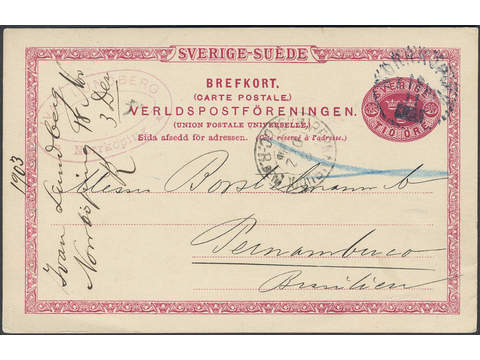 Sweden. Postal stationery, Single postcard, Facit bKe13, Postcard 10 öre sent from NORRKÖPING 18.11.1903 to Brazil. Arrival pmk PERNAMBUCO 3.DEZ.1903.