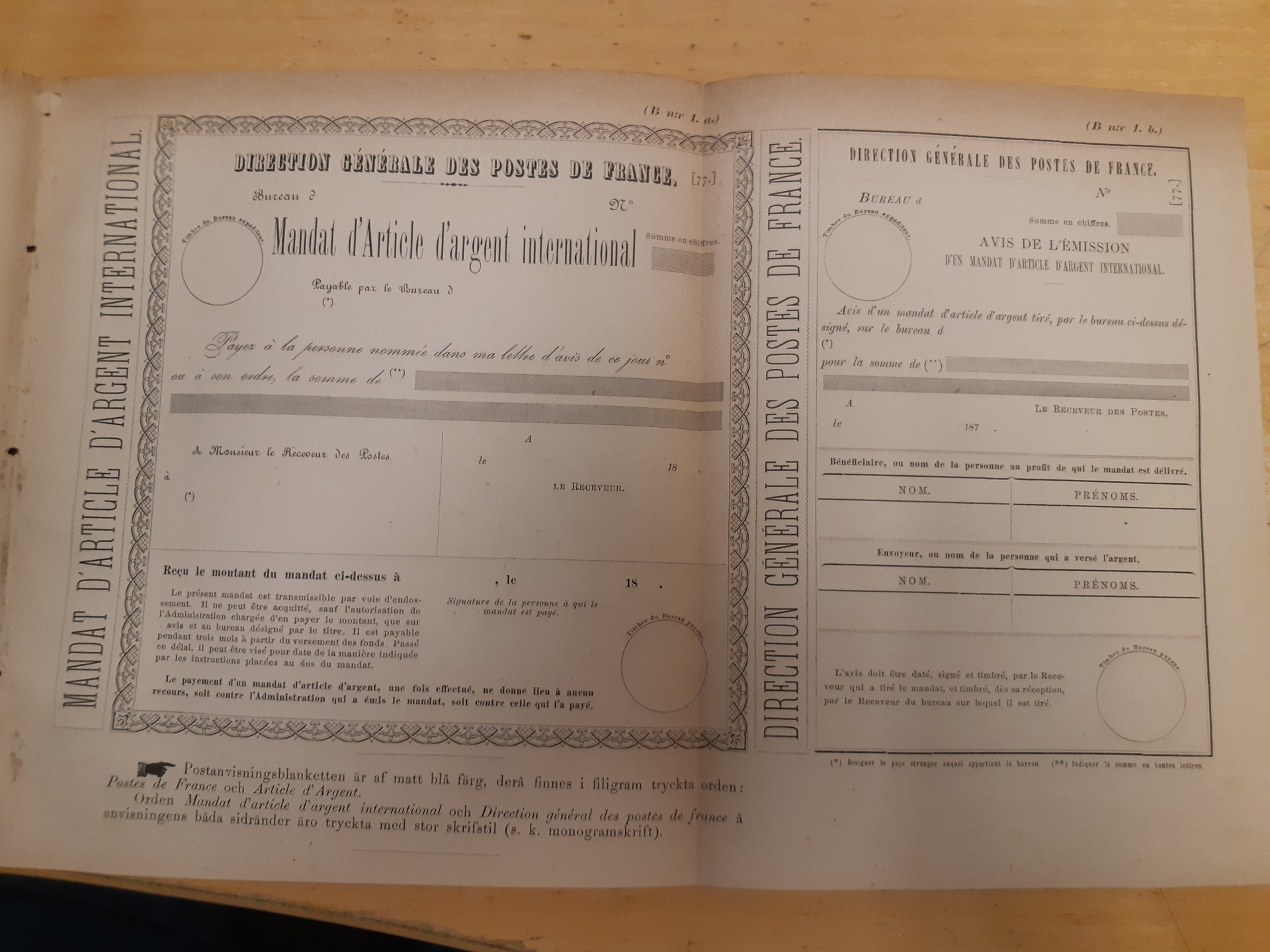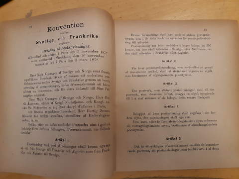 Literature. Convention between Sweden and France for the exchange of postal money orders, with associated expedition regulations, Paris/Stockholm, KGPS, 1878, 20 pp. Used, cut out from book.