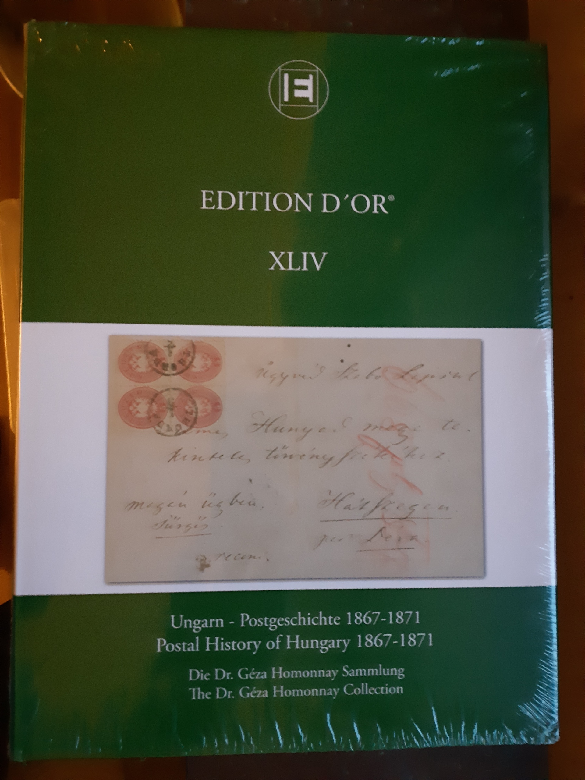 Literature. EDITION D'OR, Vol. XLIV 'Postal History of Hungary 1867–1871 – The Dr. Géza Homonnay Collection', The Global Philatelic Network, 2015. The Large Gold awarded exhibit depicted in its entirety, hardcover, with dust jacket, 174 pp., introduction bilingual English/German. Sold out at publisher. New, still wrapped in plastic.
