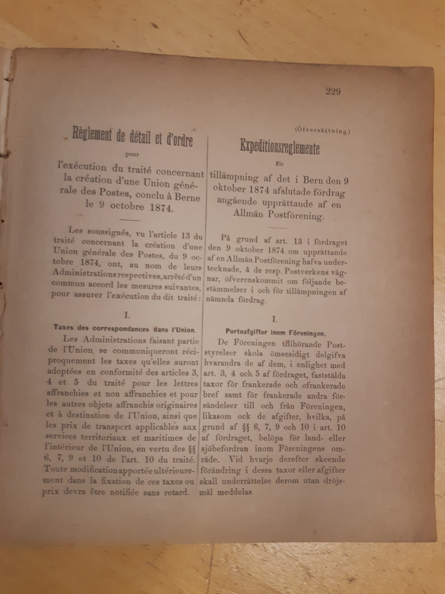 Literature. International Postal Treaty with associated expedition regulations, Bern 1874, 'Svensk författnings-samling No 20', 1875, 32 pp. + 18 pp., bilingual Swedish/French. Used, cut out from book.