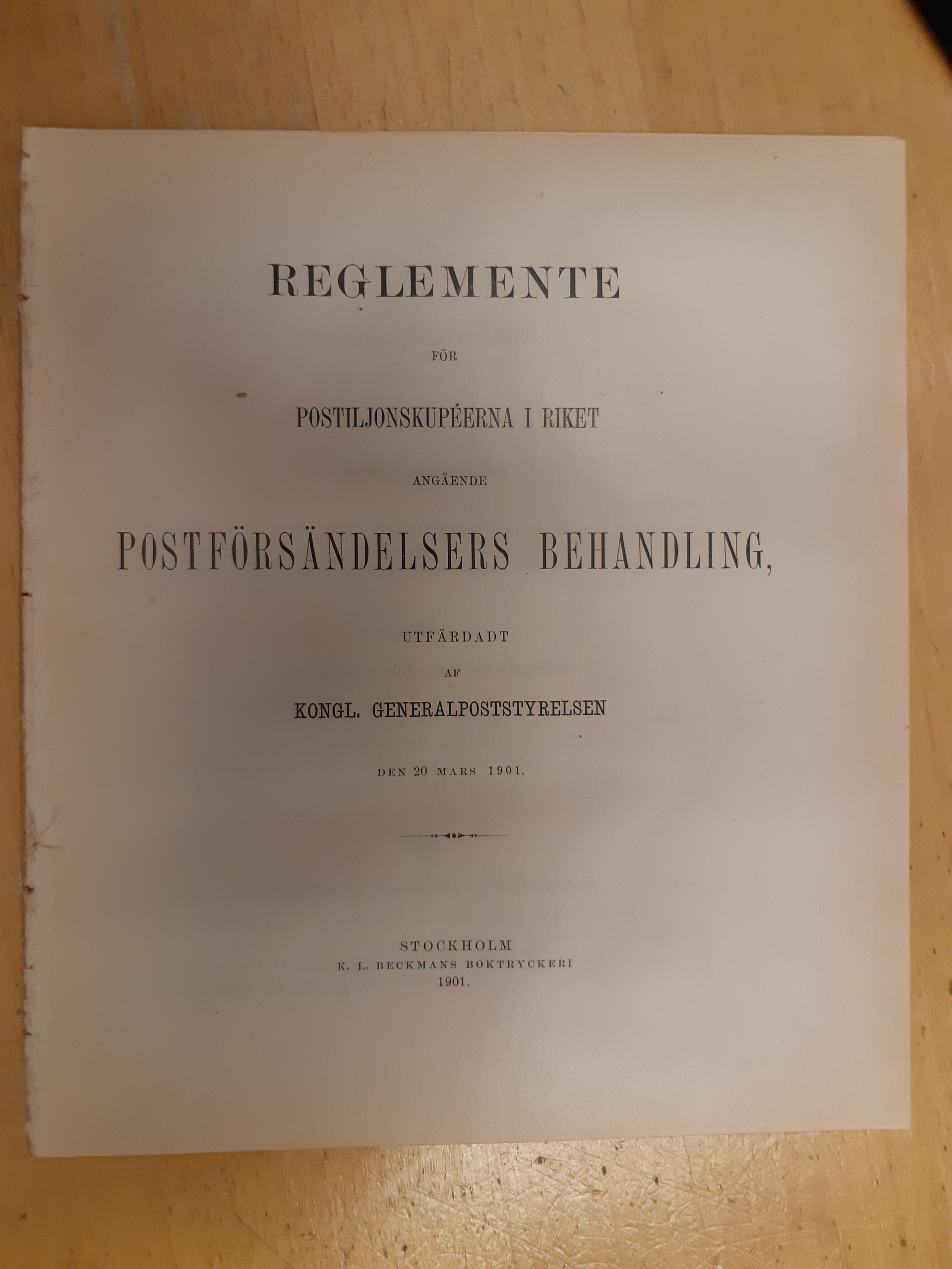 Literature. 'Reglemente för postiljonskupéerna i riket angående postförsändelsers behandling', KGPS, K. L. Beckmans Boktryckeri, 1901, 117 pp. Used, cut out from book.