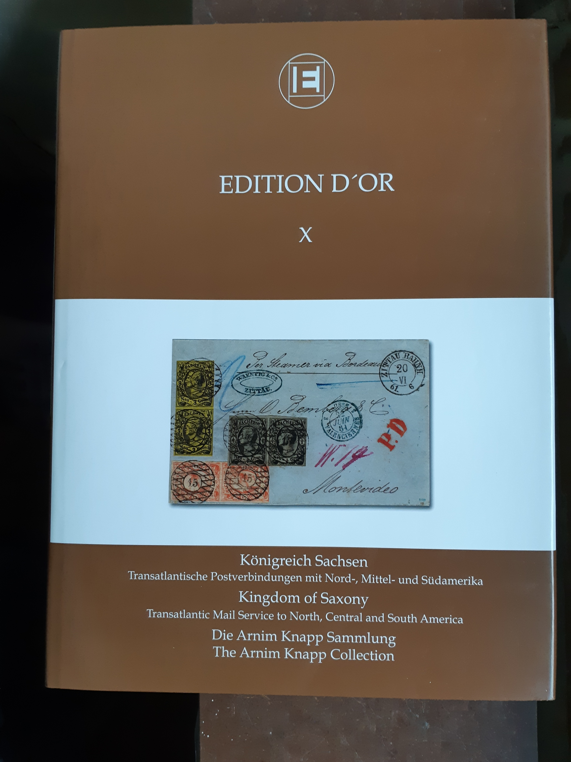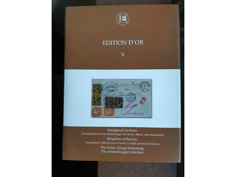 Literature, Saxony. EDITION D'OR, Vol. X: 'Kingdom of Saxony – Transatlantic Mail Service to North, Central and South America – The Arnim Knapp Collection', Heinrich Köhler, 2008. The Large Gold awarded exhibit depicted in its entirety, hardcover, with dust jacket, 324 pp., introduction bilingual English/German. Sold out at publisher. Used.