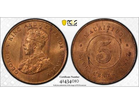 Mauritius George V (1910-1936) 5 cents 1917, UNC, PCGS MS64 RD Lagerantal: I lager 8 000 SEK Lägg i varukorgen Beskrivning Kvalitet: UNCGradering: MS64 RDKatalog: KM 14Valör: 5 cents Ex. Mark Freehill.Single coin graded RD at either PCGS or NGC.