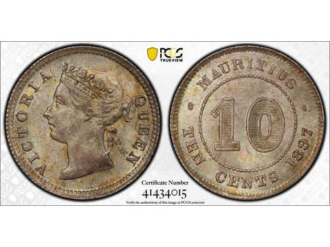 Mauritius Queen Victoria (1837-1901) 10 cents 1897, UNC, PCGS MS64 Lagerantal: I lager 5 500 SEK Lägg i varukorgen Beskrivning Kvalitet: UNCKatalog: KM 10.1Valör: 10 cents Ex. Freehill.Nicely toned, tied finest graded at PCGS.
