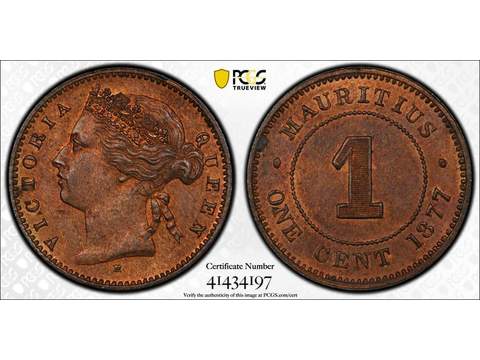 Mauritius Queen Victoria (1837-1901) 1 cent 1877, UNC, PCGS MS64 RB Lagerantal: I lager 6 000 SEK Lägg i varukorgen Beskrivning Kvalitet: UNCGradering: MS64 RBKatalog: KM 7Valör: 1 cent Ex. Mark Freehill.Finest graded by PCGS.