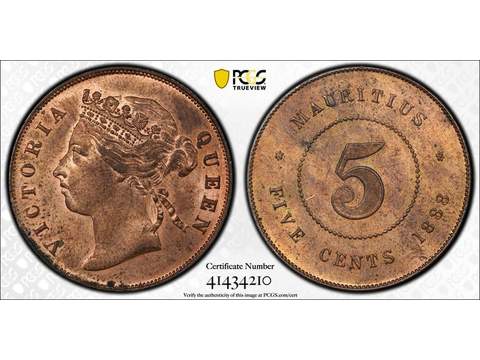 Mauritius Queen Victoria (1837-1901) 5 cents 1888, UNC, PCGS MS63 RB Lagerantal: I lager 4 700 SEK Lägg i varukorgen Beskrivning Kvalitet: UNCGradering: MS63 RBKatalog: KM 9Valör: 5 cents Ex. Mark Freehill.