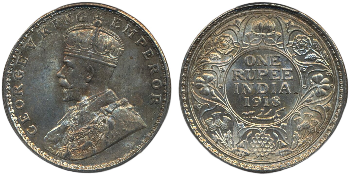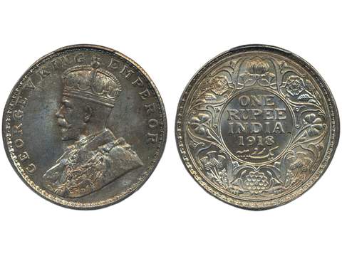 Coins, India. George V (1910-1936), KM 524, 1 rupee 1920. Bombay mint. Beautifully toned. Graded by PCGS as MS64. UNC.