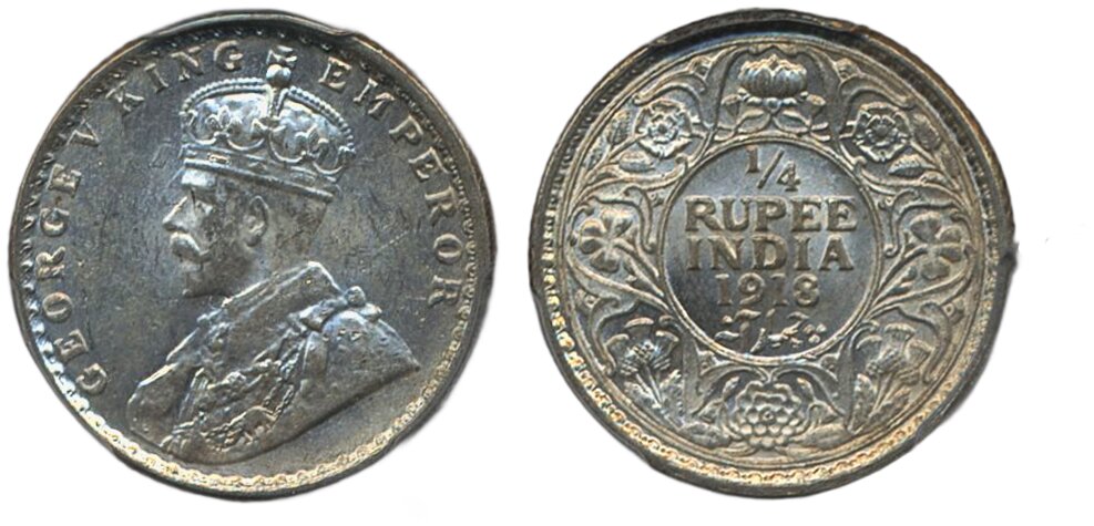 Coins, India. George V (1910-1936), KM 524, ¼ rupee 1918 C. Graded by PCGS as MS64. …