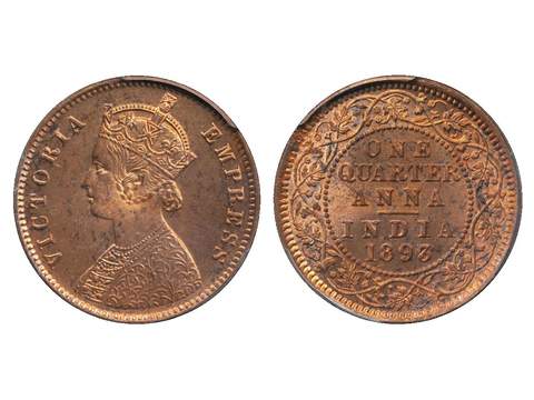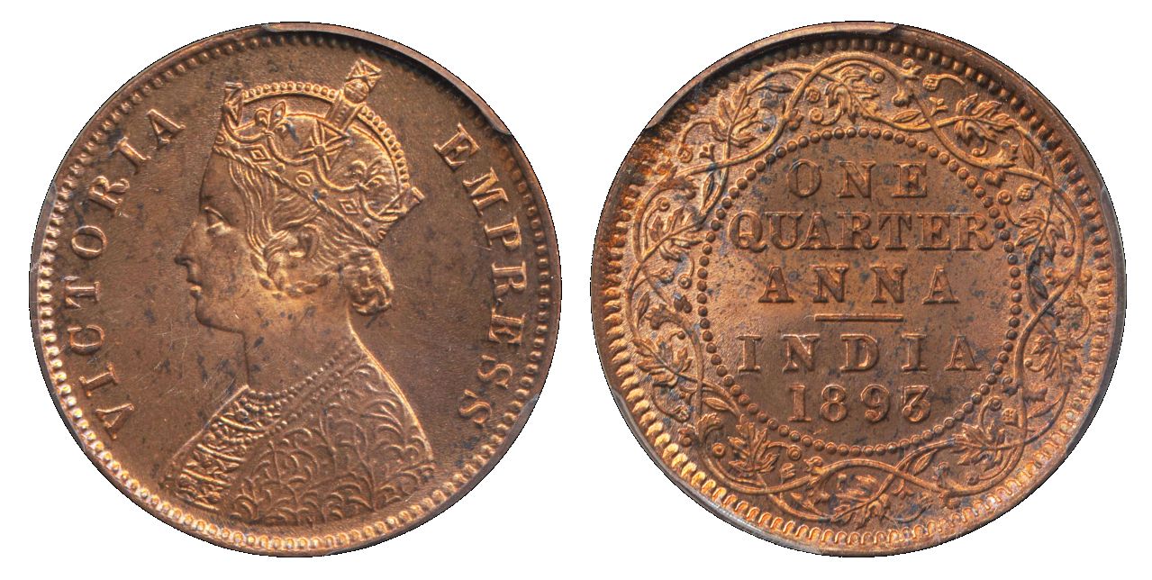Coins, India. Queen Victoria (1837-1901), KM 486, ¼ anna 1893. Calcutta mint. Graded by PCGS as MS64 RD. UNC.