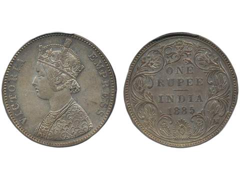 Coins, India. Queen Victoria (1837-1901), KM 492, 1 rupee 1885. Bombay mint. Graded by PCGS as AU55. SW 6.85. XF.