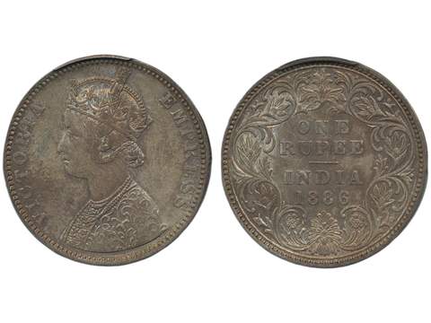 Coins, India. Queen Victoria (1837-1901), KM 492, 1 rupee 1886. Bombay mint. Graded by PCGS as AU55. SW 6.93. XF.