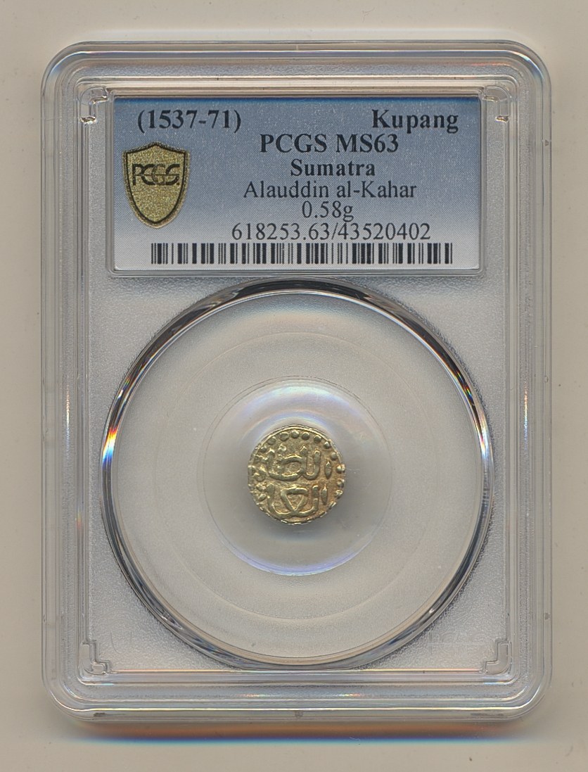 Coins, Indonesia, Sumatra. Alauddin al-Kahar (1537-71), SS 538, 1 kupang ND. 0.58 g. Attractive lustrous example. Graded by PCGS as MS63. Wilkes 4445. XF-UNC.