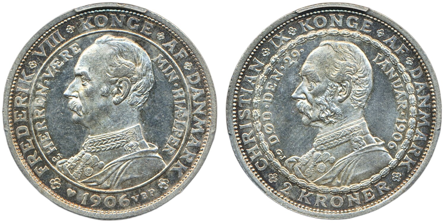 Coins, Denmark. Frederik VIII, Sieg 4, 2 kronor 1906. Death of Christian IX/Accession of Fredrik VIII commemorative. Graded by PCGS as MS63. 01/0.