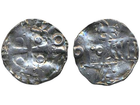 Coins, Germany, Cologne. Otto III (983-1002), 1 pfennig ND. 0.96 g. Soest (?) mint. Cologne monogram with retrograde S)(Confused legend with cross with pellets in four angles. Wavy flan, minor peck marks. VF-XF.