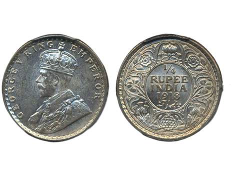 Coins, India. George V (1910-1936), KM 524, ¼ rupee 1918 C. Graded by PCGS as MS64. XF-UNC.