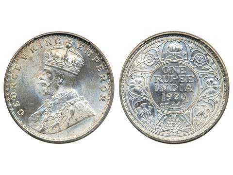 Coins, India. George V (1910-36), KM 524, 1 rupee 1920 (B). Beautifully champagne toned coin. In PCGS slab as MS64. UNC.