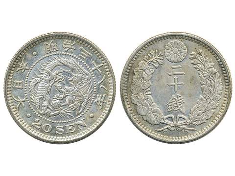 Coins, Japan. Mutsohito (1867-1912), KM Y-25, 20 sen 1905 (Meiji 38). Lightly cleaned. …