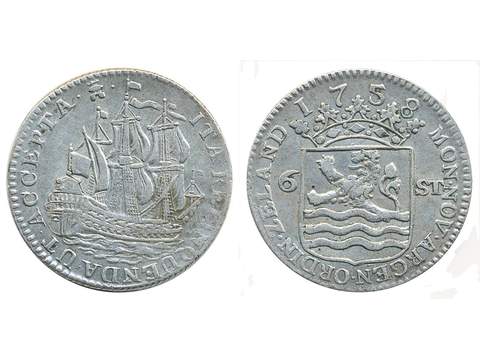 Coins, Netherlands, Zeeland. KM 90, 6 stuivers 1758. 4.95 g. VF.