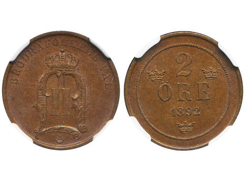 Coins, Sweden. Oskar II, MIS II.21, 2 öre 1892. Graded by NGC as MS64 BN. 01/0.