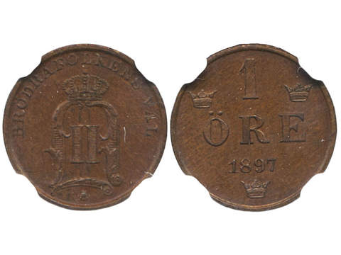 Coins, Sweden. Oskar II, MIS III.22, 1 öre 1897. Graded by NGC as MS64 BN. 01/0.