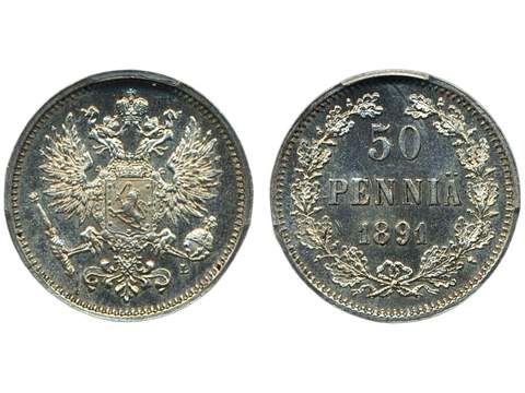 Coins, Finland. Alexander III, KM 2.2, 50 penniä 1891. Graded by PCGS as MS64. Bitkin …