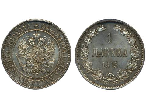 Coins, Finland. Nicholas II, KM 3.2, 1 markka 1915. Graded by PCGS as MS64. Bitkin 401. …