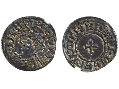 Coins, Great Britain. Edward the Confessor, Spink 1173, 1 penny ND. 0.77 g. Warwick mint. Eicefric, moneyer. Radiate head with short cross reverse. Minor edge loss. North 816. VF-XF.