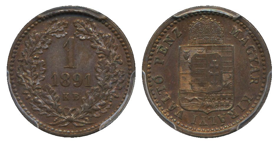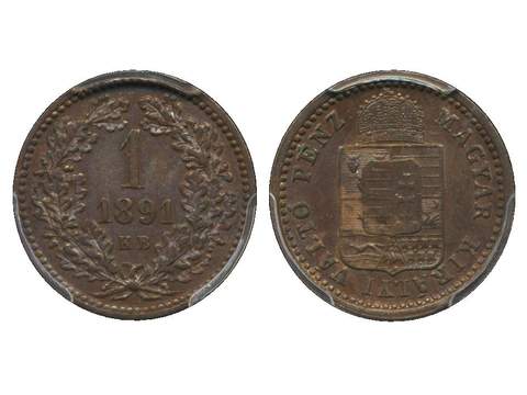 Coins, Hungary. Franz Joseph (1848-1916), KM 478, 1 krajczar 1891. Graded by PCGS as AU58. In our opinion very conservatively graded lustrous example. XF.