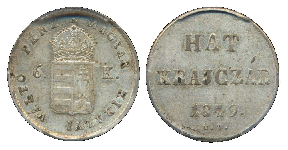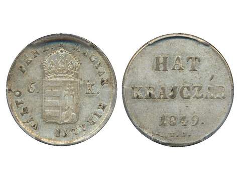 Coins, Hungary. KM 435, 6 krajczar 1849. Graded by PCGS as AU55. Lustrous example, conservatively graded. XF.