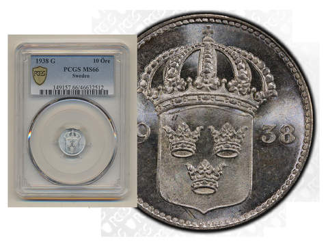 Coins, Sweden. Gustav V, MIS I.20a, 10 öre 1938. Graded by PCGS as MS66. Only one specimen graded higher by PCGS. SM 159. 0.