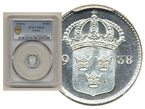 Coins, Sweden. Gustav V, MIS I.20a, 10 öre 1938. Graded by PCGS as MS66. Only one specimen graded higher by PCGS. SM 159. 0.