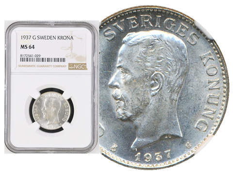 Coins, Sweden. Gustav V, MIS I.23a, 1 krona 1937. Graded by NGC as MS64. SM 56a. 01/0.