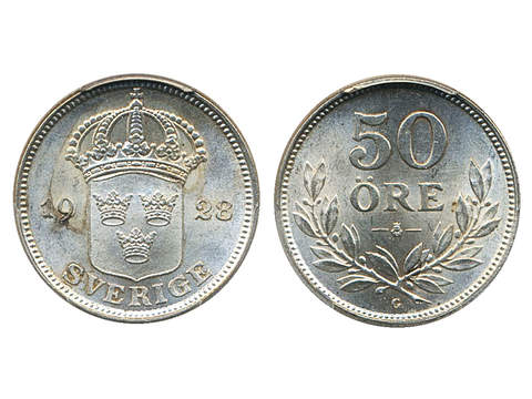 Coins, Sweden. Gustav V, MIS I.7, 50 öre 1928. Graded by PCGS as MS64. 01/0.