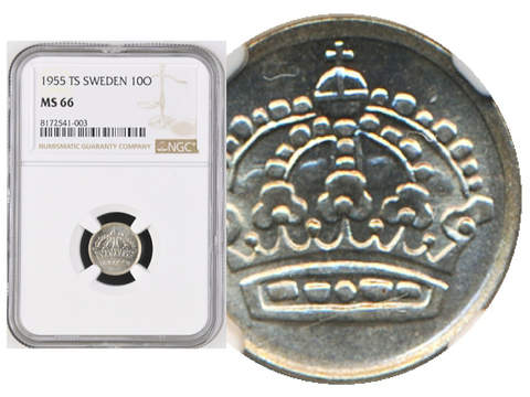 Coins, Sweden. Gustav VI Adolf, MIS I.4, 10 öre 1955. Tied finest graded by NGC as MS66. SM 96. 0.