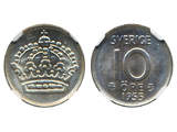 Coins, Sweden. Gustav VI Adolf, MIS I.4, 10 öre 1955. Tied finest graded by NGC as MS66. …
