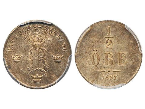 Coins, Sweden. Oskar I, SM 141, ½ öre 1857. Graded by PCGS as MS64 RB. 01/0.