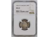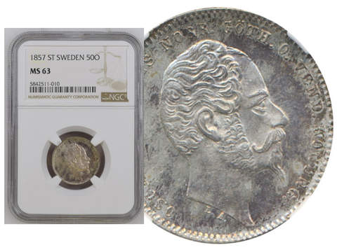 Coins, Sweden. Oskar I, SM 61, 50 öre 1857. Graded by NGC as MS63. 01/0.