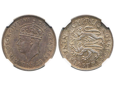 Coins, Cyprus. George VI (1936-1952), KM 25, 9 piastres 1940. Graded by NGC as MS62. XF-UNC.