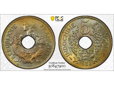 Franska Indokina 5 centimes 1938, UNC, PCGS MS64