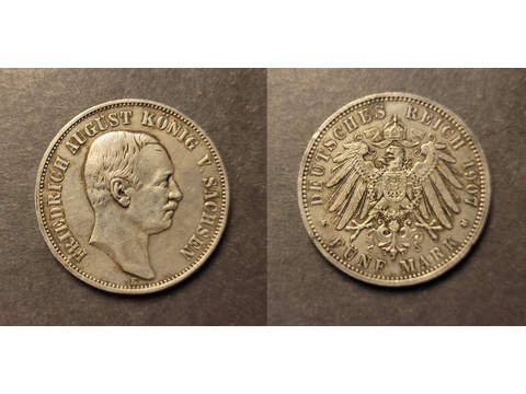 Germany - Saxony. Friedrich August III (1904-1918) 5 mark 1907, VF-XF