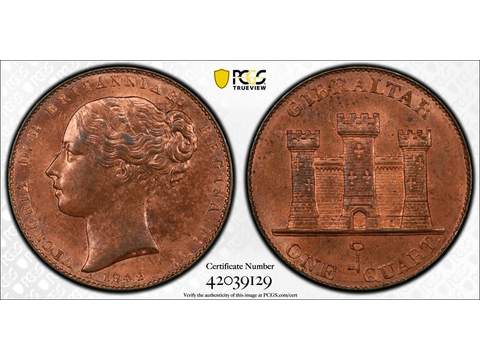 Gibraltar Queen Victoria (1837-1901) 1 quart 1842/0, UNC Full röd lyster PCGS MS64RD